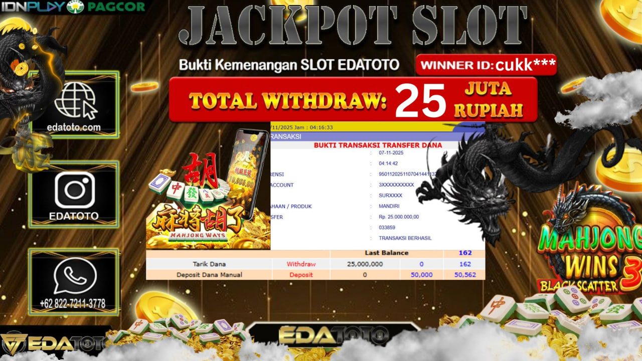 Selamat Kepada Pemilik user ID : Nik*** Hari/Tanggal : RABU / 5, November 2025 Jackpot : Rp. 25,000,000 JT Withdraw :25,000,000 . . .