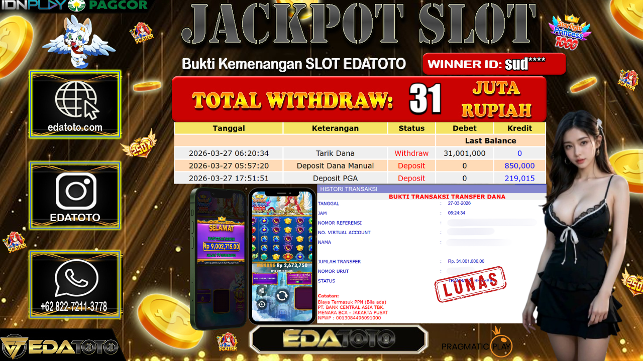 Selamat Kepada Pemilik user ID : Sud Hari/Tanggal : Jumat / 27 MARET 2026 Jackpot : Rp, 29,256,820 JT Withdraw . . .