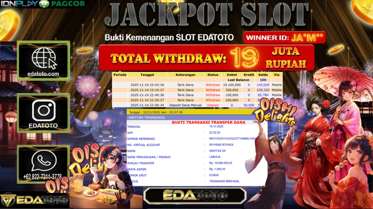 Selamat Kepada Pemilik user ID : EKO**** Hari/Tanggal : Sabtu / 15, November 2025 Jackpot : Rp. 33,120,000 JT Withdraw :23,000,000 . . .